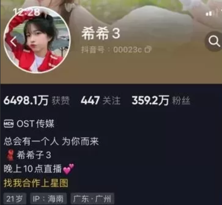 希希3抖音号:00023c,IP属地:广东,21岁,晚上十点直播