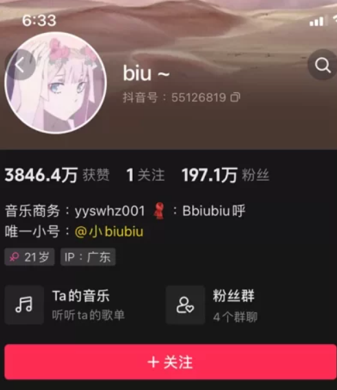 Bbiubiu呼,biu ~知名抖音音乐博主,其抖音号:55126819,IP属地:广东,21岁,唯一小号:@小biubiu,微博:Bbiubiu呼。抖音上有很多她唱歌的作品,感兴趣自己可以去看看~