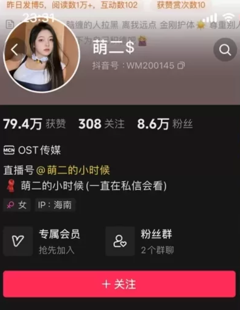 据了解萌二抖音号:WM200145,IP属地:广东,直播号@萌二的小时候,微博:@萌二的小时候!