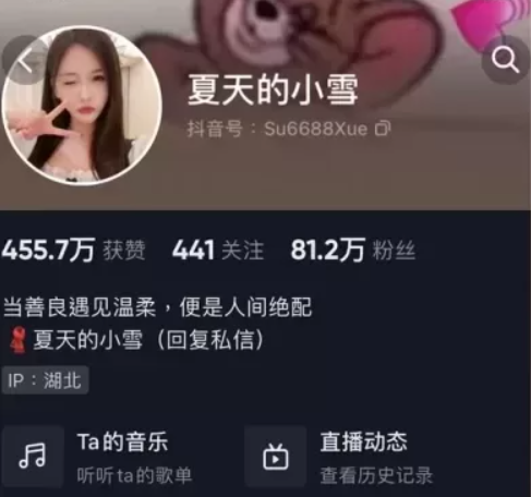 据了解抖音号:Su6688Xue,IP属地:湖北,直播在@苏雪,微博同名:夏天的小雪hh,感兴趣的可以关注了解下~