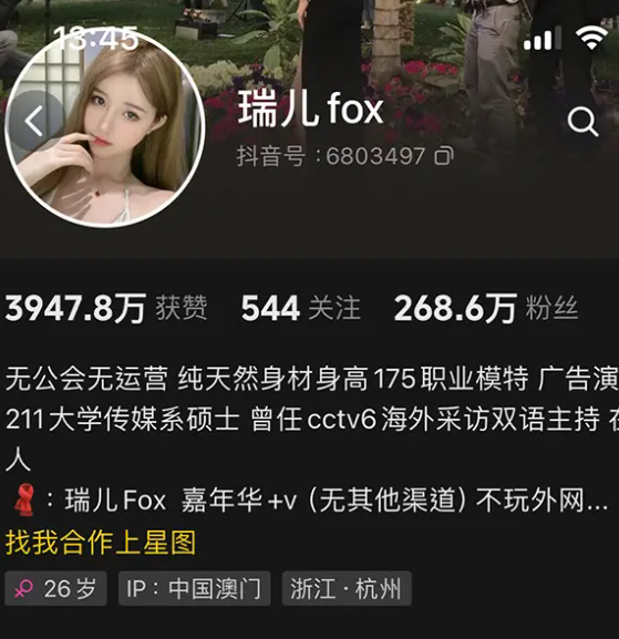 抖音号:6803497,IP属地:中国澳门,26岁,浙江·杭州,纯天然身材身高175职业模特,211大学传媒系硕士,曾任cctv6海外采访双语主持,在职艺人,微博::瑞儿Fox 嘉年华+v (无其他渠道)不玩外网均为冒充我。